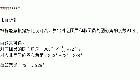 某校七年级学生中,团员与非团员的人数比为1:4,若用扇形统计图表示这一结果,则对应团员和非团员的圆心角分别为_____.