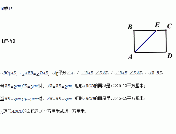 矩形ABCD中,∠A的平分线分边BC为2厘米和3厘米两部分,则矩形ABCD的面积是____________。