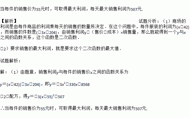 当每件的销售价为55元时,可取得最大利润,每天最大销售利润为507元. 【解析】试题分析:(1)商场的利润是由每件商品的利润乘每天的销售的数量所决定.在这个问题中,每件服装的利润为(x-42),而销售的件数是(-3x+204),由销售利润y=(售价-成本)×销售量,那么就能得到一个y与x之间的函数关系,这个函数是二次函数. (2)要求销售的最大利润,就是要求这个二次函数的最大值. ...
