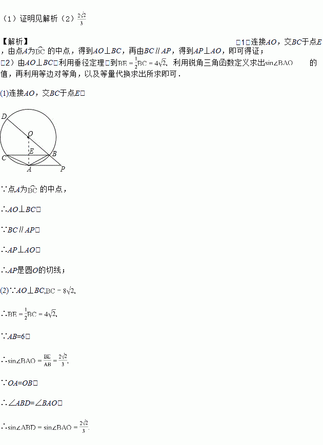 如图,⊙O中,点A为中点,BD为直径,过A作AP∥BC交DB的延长线于点P.