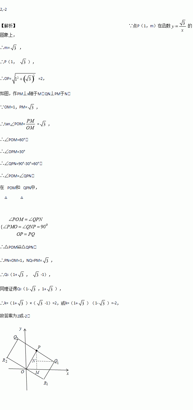 在直角坐标系中,O 为坐标原点,设点 P(1,m)在函数的图象上,以 OP 为边作正方形OPQR,若反比例函数 经过点 Q,则 k=______________.