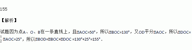 如图,点A、O、B在一条直线上,且∠AOC=50°,OD平分∠AOC,则∠BOD=___度.