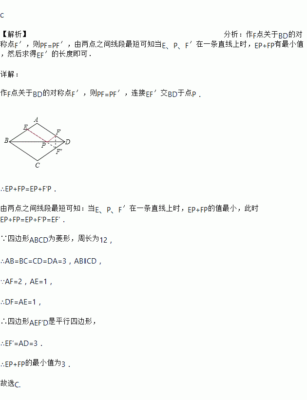 如图,在周长为12的菱形ABCD中,AE=1,AF=2,若P为对角线BD上一动点,则EP+FP的最小值为( )