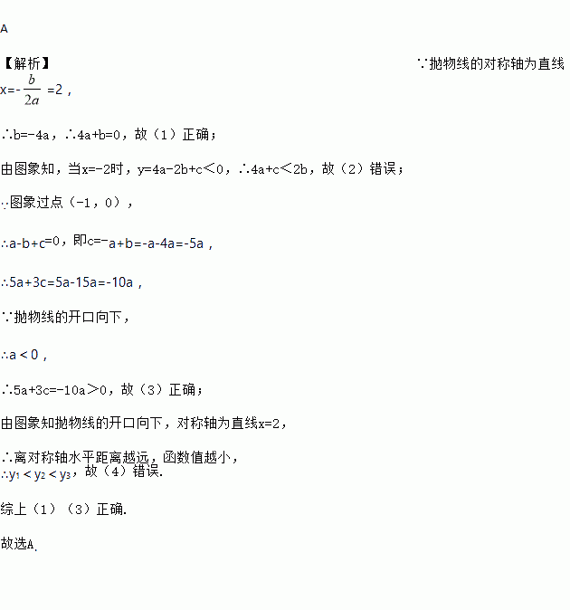二次函数y=ax2+bx+c(a≠0)的部分图象如右图所示,图象过点(-1,0),对称轴为直线x=2,系列结论:(1)4a+b=0;(2)4a+c>2b;(3)5a+3c>0;(4)若点A(-2,y1),点B(,y2),点C(,y3)在该函数图象上,则y1<y3<y2;其中正确的结论有( )