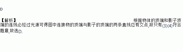 D 【解析】根据物体的顶端和影子顶端的连线必经过光源可得图中连接物的顶端与影子的顶端的两条直线应有交点,故只有(3)(4)符合题意,故选D.