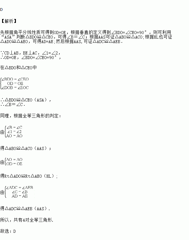 如图,CD⊥AB,BE⊥AC,垂足分别为D,E,BE与CD相交于点O,且∠1=∠2,则下列结论正确的个数为( )
