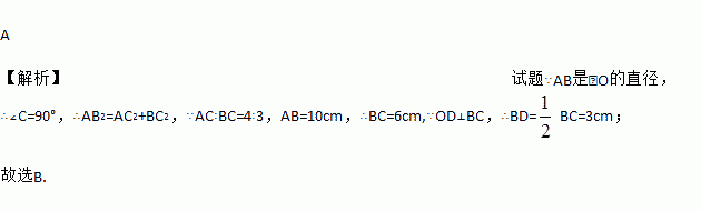 如图,AB是⊙O的直径,C是⊙O上一点,若AC∶BC=4∶3,AB=10cm,OD⊥BC于D,则BD的长为( )