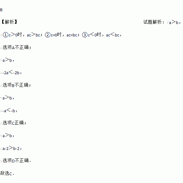 A. 由a>b得ac>bc B. 由a>b得﹣2a>﹣2b