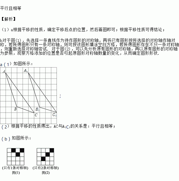 (b)如图,在正方形网格中,已有2个小正方形被涂黑.分别在下面2张图中再将若干个空白的小正方形涂黑,使得涂黑的图形成为轴对称图形.(图(1)要求只有1条对称轴,图(2)要求只有2条对称轴).