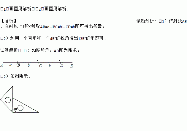 (1)画图见解析;(2)画图见解析. 【解析】试题分析:(1)作射线AE,在射线上顺次截取AB=a,BC=b,CD=b即可得出答案; (2)利用一个直角和一个45°的锐角得出135°的角即可. 试题解析:(1)如图所示:AD即为所求; (2)如图所示: