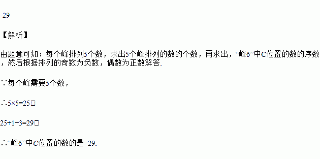 将一列有理数-1,2,-3,4,-5,6,……,如图所示有序排列.根据图中的排列规律可知,“峰1”中峰顶的位置(C的位置)是有理数4,那么,“峰6”中C的位置是有理数________.