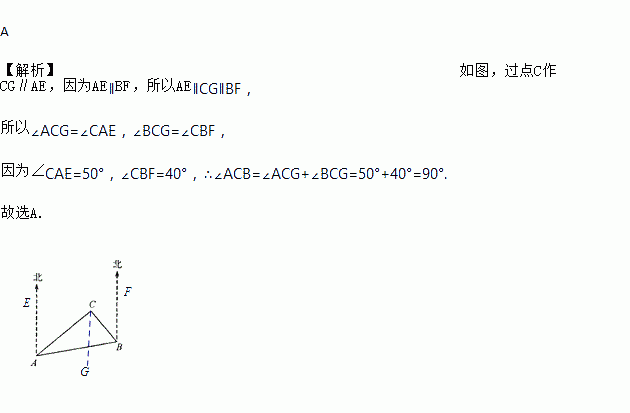 A 【解析】如图,过点C作CG∥AE,因为AE∥BF,所以AE∥CG∥BF, 所以∠ACG=∠CAE,∠BCG=∠CBF, 因为∠CAE=50°,∠CBF=40°,∴∠ACB=∠ACG+∠BCG=50°+40°=90°. 故选A.