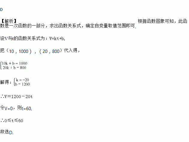 C. V=1200-20t D. V=1200-20t(0≤t≤60)