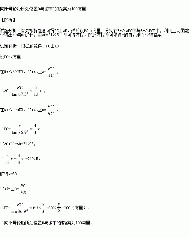 如图某天上午9时,向阳号轮船位于A处,观测到某港口城市P位于轮船的北偏西67.5°,轮船以21海里/时的速度向正北方向行驶,下午2时该船到达B处,这时观测到城市P位于该船的南偏西36.9°方向,求此时轮船所处位置B与城市P的距离?(参考数据:sin36.9°≈