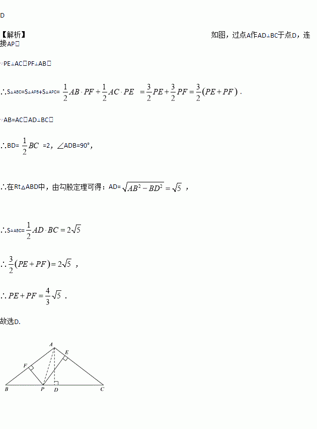 如图,等腰△ABC中,AB=AC=3,BC=4,P是BC上不与B和C重合的一个动点,过点P分别作AB和AC的垂线,垂足为E,F. 则PE+PF=( )