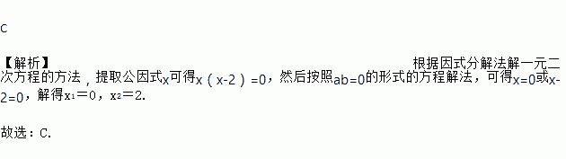 C 【解析】根据因式分解法解一元二次方程的方法,提取公因式x可得x(x-2)=0,然后按照ab=0的形式的方程解法,可得x=0或x-2=0,解得x1=0,x2=2. 故选:C.