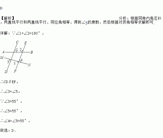 如图,已知∠1+∠2=180°,∠3=55°.那么∠4的度数是( )