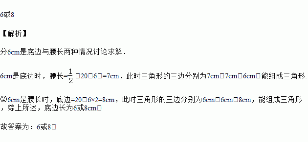 等腰三角形的周长为20cm,一边长为6cm,则底边长为______ cm.