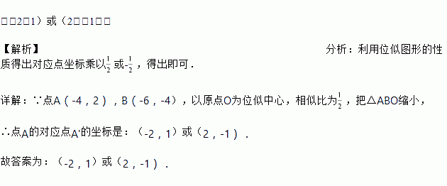 在平面直角坐标系中,已知点A(﹣4,2),B(﹣6,﹣4),以原点O为位似中心,相似比为,把△ABO缩小,则点A的对应点A'的坐标是_____.