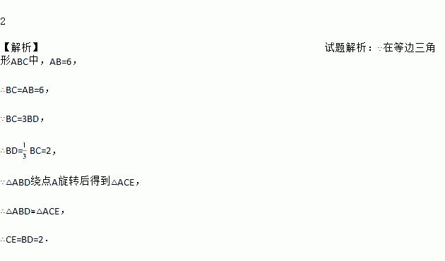 如图,在等边三角形ABC中,AB=6,D是BC上一点,且BC=3BD,△ABD绕点A旋转后得到△ACE,则CE的长度为_____.
