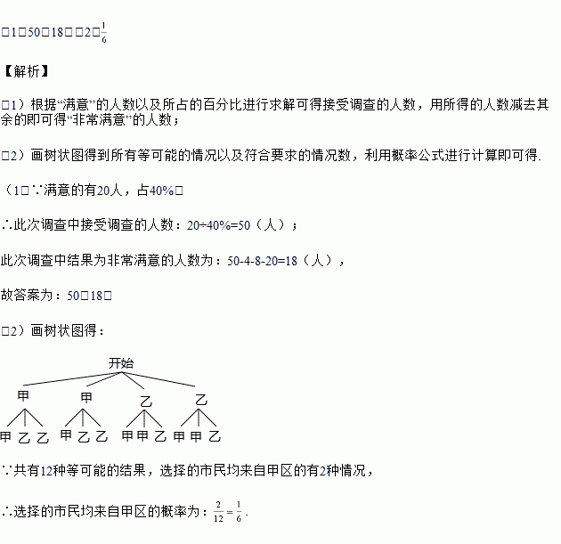 (2)兴趣小组准备从“不满意”的4位群众中随机选择2位进行回访,已知这4位群众中有2位来自甲片区,另2位来自乙片区,请用画树状图或列表的方法求出选择的群众来自甲片区的概率.