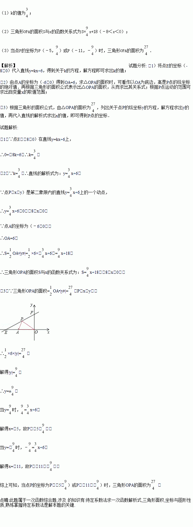 如图,直线y=kx+6与x、y轴分别交于E、F.点E坐标为(﹣8,0),点A的坐标为(﹣6,0),P(x,y)是直线y=kx+6上的一个动点.