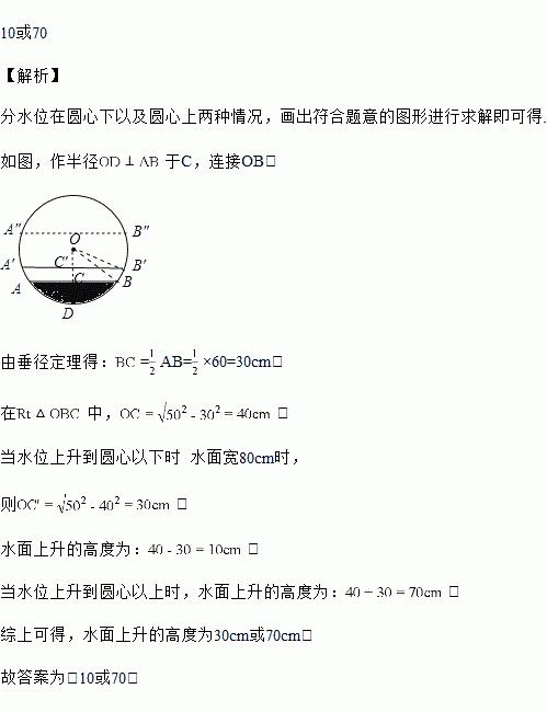 如图,一下水管道横截面为圆形,直径为100cm,下雨前水面宽为60cm,一场大雨过后,水面宽为80cm,则水位上升______cm.