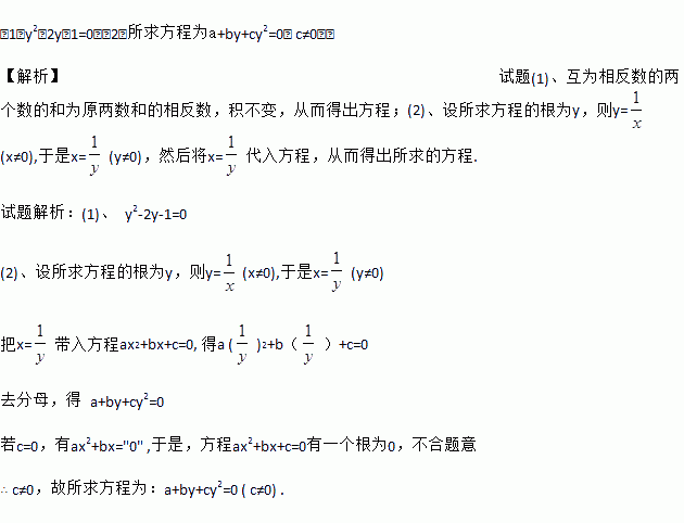 (2)已知关于x的一元二次方程ax2+bx+c=0(a≠0)有两个不等于零的实数根,求一个一元二次方程,使它的根分别是已知方程根的倒数.