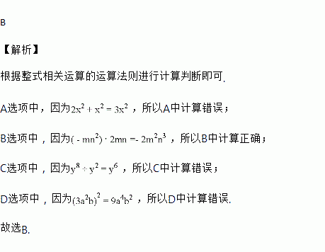 A. 2x2+x2=3x4 B. (-mn2)·2mn=-2m2n3 C. y8÷y2=y4 D. (3a2b)2=6a4b2