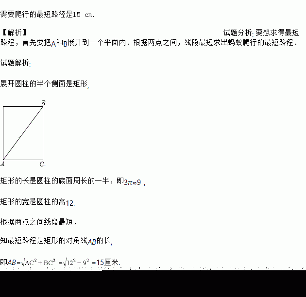 如图,有一个圆柱,它的高等于12 cm,底面半径等于3 cm,在圆柱的底面A点有一只蚂蚁,它想吃到上底面上与A点相对的B点的食物,需要爬行的最短路程是多少?(π取3)