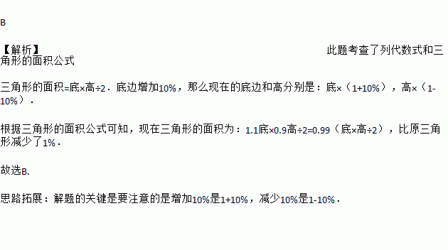 B 【解析】此题考查了列代数式和三角形的面积公式 三角形的面积=底×高÷2.底边增加10%,那么现在的底边和高分别是:底×(1+10%),高×(1-10%). 根据三角形的面积公式可知,现在三角形的面积为:1.1底×0.9高÷2=0.99(底×高÷2),比原三角形减少了1%. 故选B. 思路拓展:解题的关键是要注意的是增加10%是1+10%,减少10%是1-10%. ...