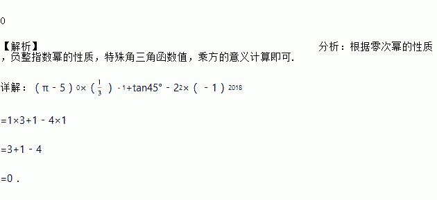 计算:(π﹣5)0×()﹣1+tan45°﹣22×(﹣1)2018