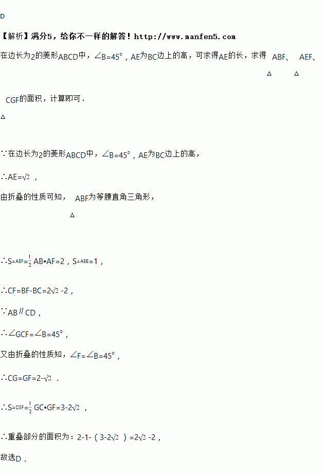 如图,在菱形ABCD中,AE⊥BC于E,将△ABE沿AE所在直线翻折得△AEF,若AB=2,∠B=45°,则△AEF与菱形ABCD重叠部分(阴影部分)的面积为( ).