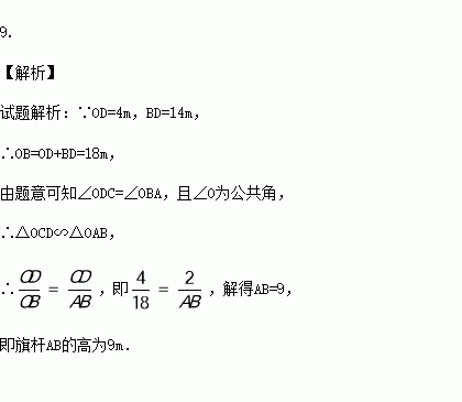 如图,数学活动小组为了测量学校旗杆AB的高度,使用长为2m的竹竿CD作为测量工具.移动竹竿,使竹竿顶端的影子与旗杆顶端的影子在地面O处重合,测得OD=4m,BD=14m,则旗杆AB的高为 m.