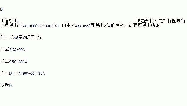 D 【解析】试题分析:先根据圆周角定理得出∠ACB=90°,∠A=∠D,再由∠ABC=65°可得出∠A的度数,进而可得出结论. 【解析】 ∵AB是O的直径, ∴∠ACB=90°. ∵∠ABC=65°, ∴∠D=∠A=90°?65°=25°. 故选D.