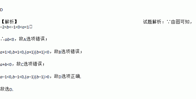 D 【解析】试题解析:∵由图可知,?20,b+1<0,(a+1)(b+1)<0,故B选项错误; a+b<0,故C选项错误; a?1<0,b?1<0,(a?1)(b?1)>0,故D选项正确. 故选D.