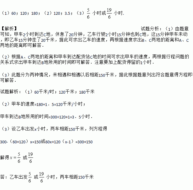 (1)60;120;180;(2)120;3.5;(3)小时或小时. 【解析】试题分析:(1)由题意可知,甲车2小时到达C地,休息了20分钟,乙车行驶2小时15分钟也到C地,这15分钟甲车未动,即乙车15分钟走了20千米,据此可求出乙车的速度,再根据速度求出B、C两地的距离和A、C两地的距离即可解答. (2)根据A、C两地的距离和甲车到达配货站C地的时间可求出甲车的速度,再根据行程问题...