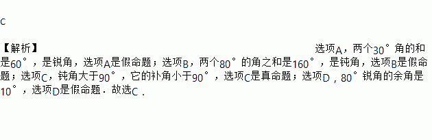A. 两个锐角之和为钝角 B. 两个锐角之和为锐角