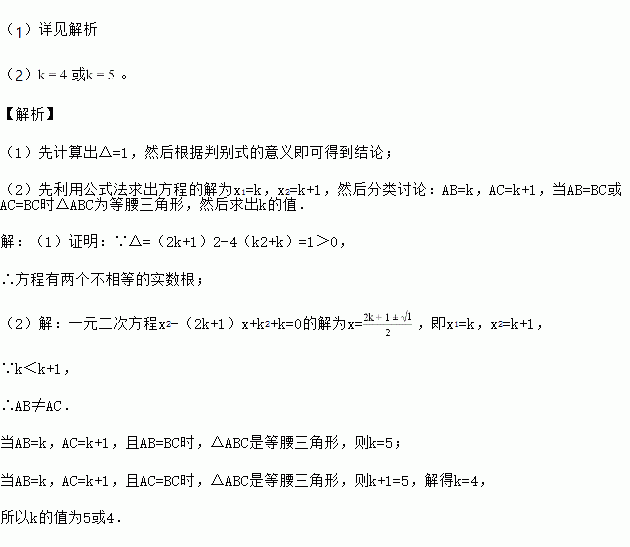 (2)若△ABC的两边AB、AC的长是方程的两个实数根,第三边BC的长为5。当△ABC是等腰三角形时,求k的值。