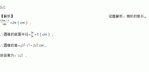 扇形的半径为3cm,圆心角为120°,用它做一个圆锥模型的侧面,这个圆锥的高为_____cm.