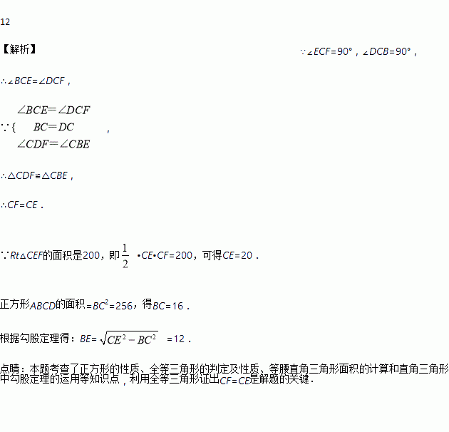 如图,正方形ABCD的面积为256,点F在AD上,点E在AB的延长线上,直角△CEF的面积为200,则BE的值为____。