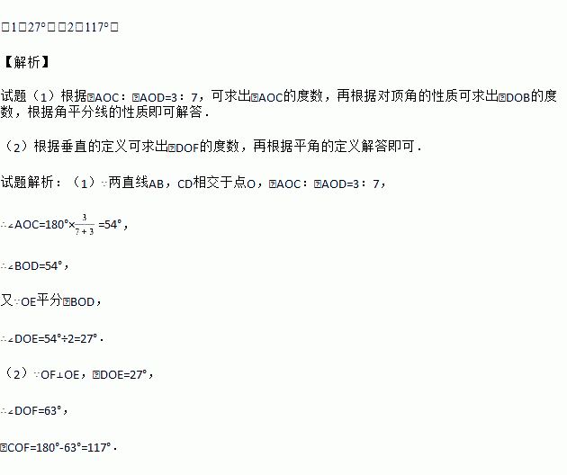 如图,两直线AB,CD相交于点O,已知OE平分∠BOD,且∠AOC:∠AOD=3:7,