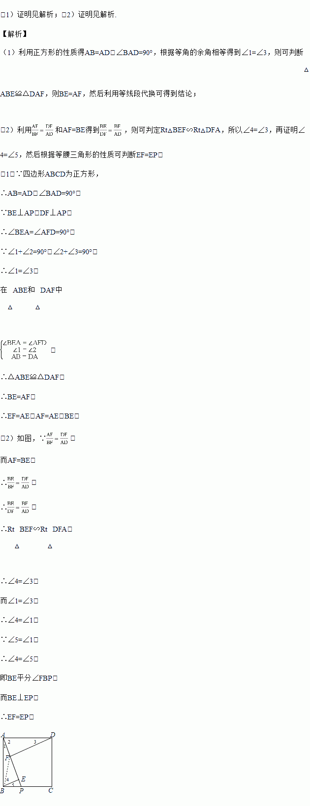 已知:如图,正方形ABCD中,P是边BC上一点,BE⊥AP,DF⊥AP,垂足分别是点E、F.