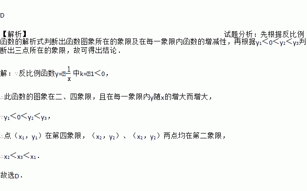 D 【解析】试题分析:先根据反比例函数的解析式判断出函数图象所在的象限及在每一象限内函数的增减性,再根据y1<0<y2<y3判断出三点所在的象限,故可得出结论. 【解析】 ∵反比例函数y=﹣中k=﹣1<0, ∴此函数的图象在二、四象限,且在每一象限内y随x的增大而增大, ∵y1<0<y2<y3, ∴点(x1,y1)在第四象限,(x2,y2)、(x2,y2)两点均在第...