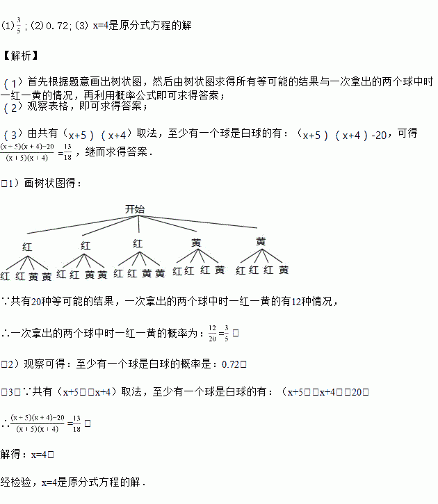 (2)往箱子中再加入x个白球,从箱子里一次拿出的两个球,多次实验统计如下