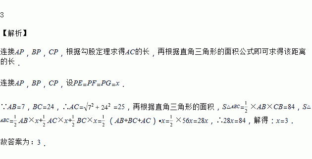 如图,在△ABC中,已知∠B=90°,AB=7,BC=24,△ABC内一点P到各边的距离相等,则这个距离是__.