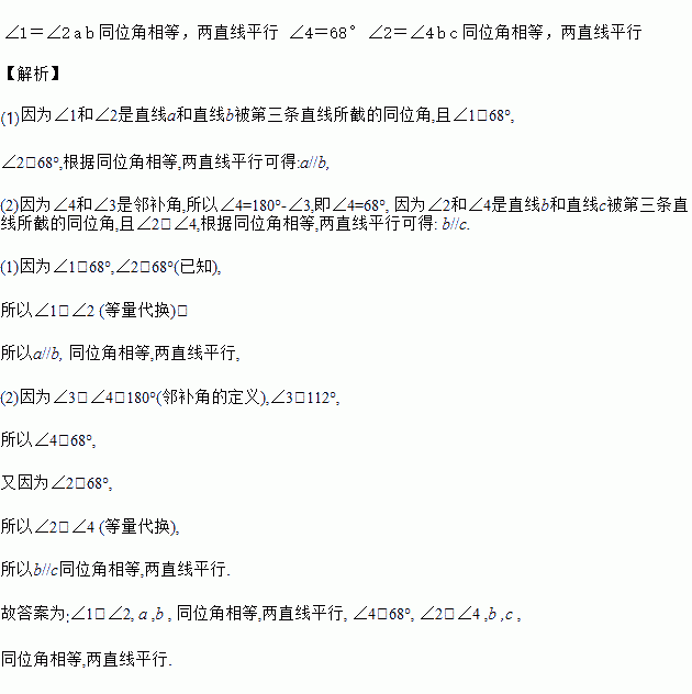 如图,已知∠1=68°,∠2=68°,∠3=112°.在下列解答中,填空: