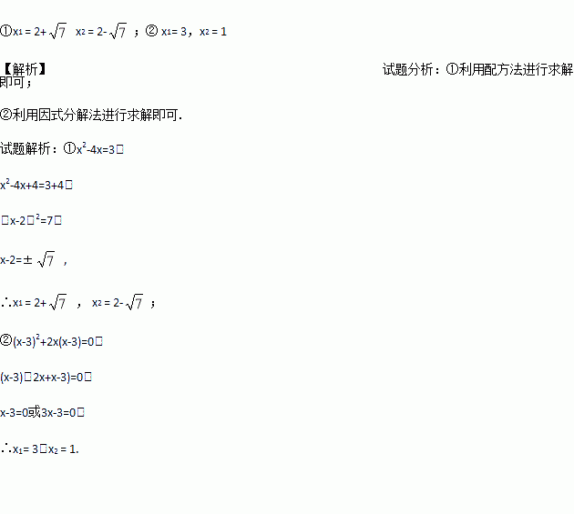 解方程:①x2-4x-3=0;②(x-3)2+2x(x-3)=0