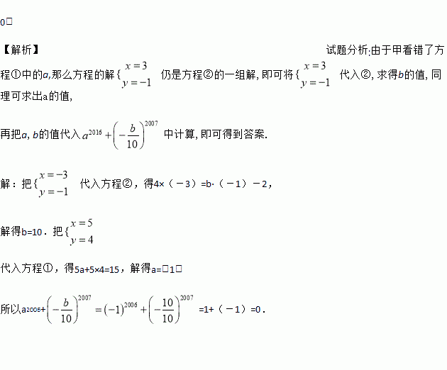 甲、乙两人同解方程组时,甲看错了方程①中的a,解得,乙看错了②中的b,解得,试求的值.