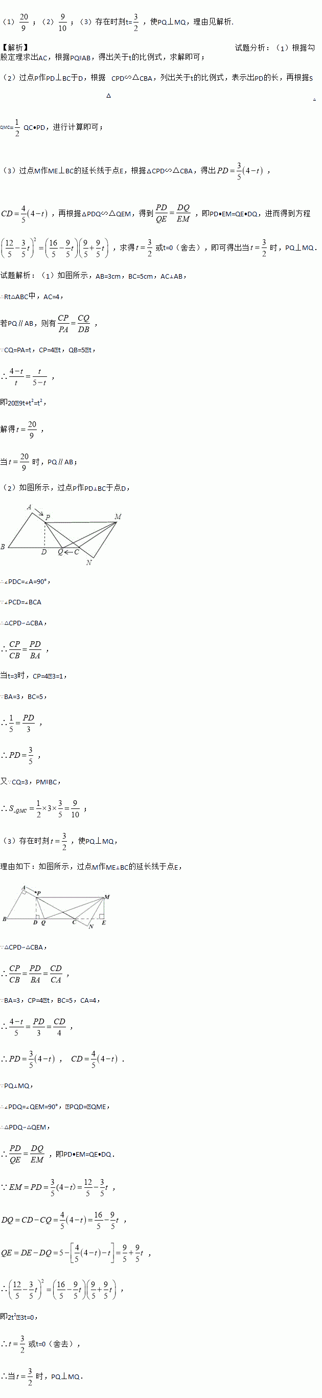 (3)是否存在某一时刻t,使PQ⊥MQ?若存在,求出t的值;若不存在,请说明理由